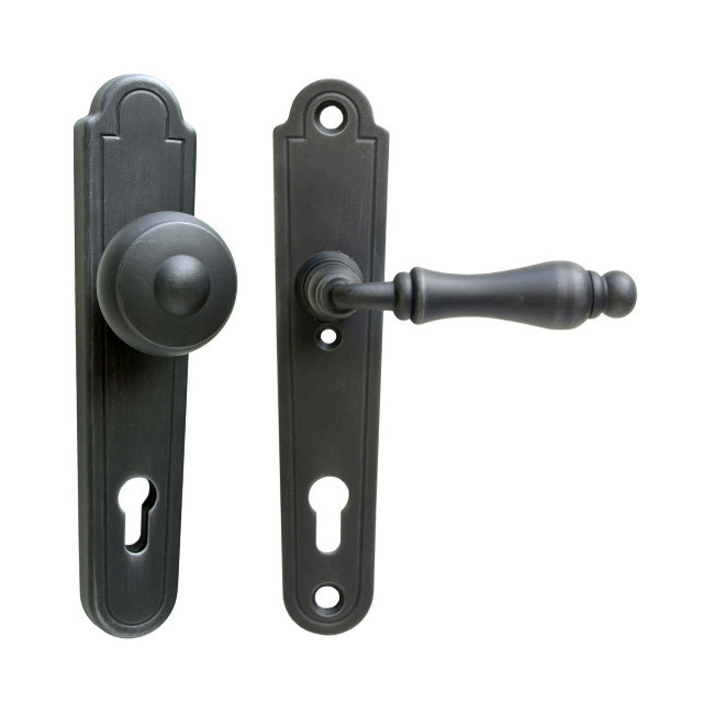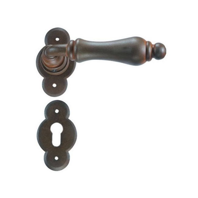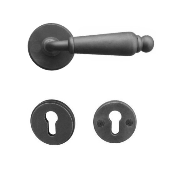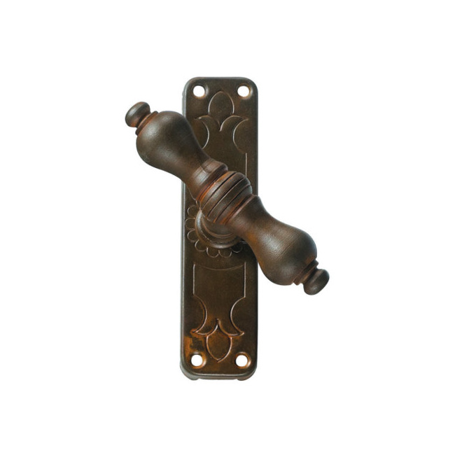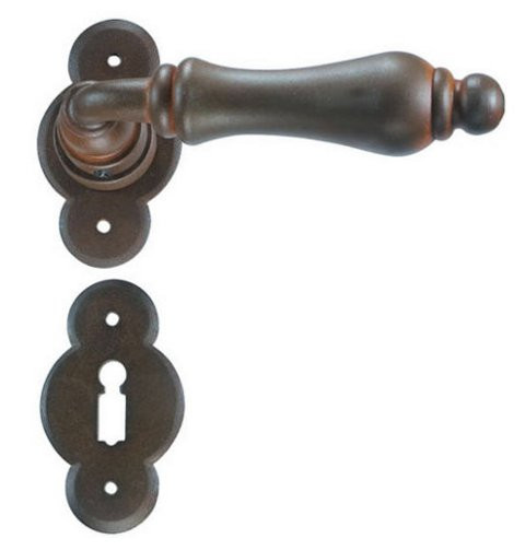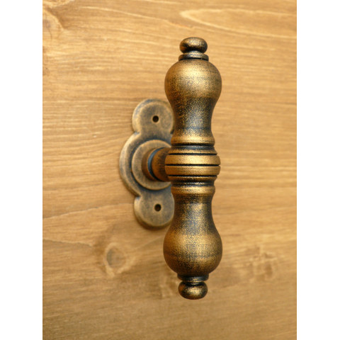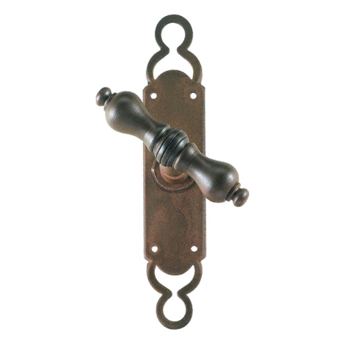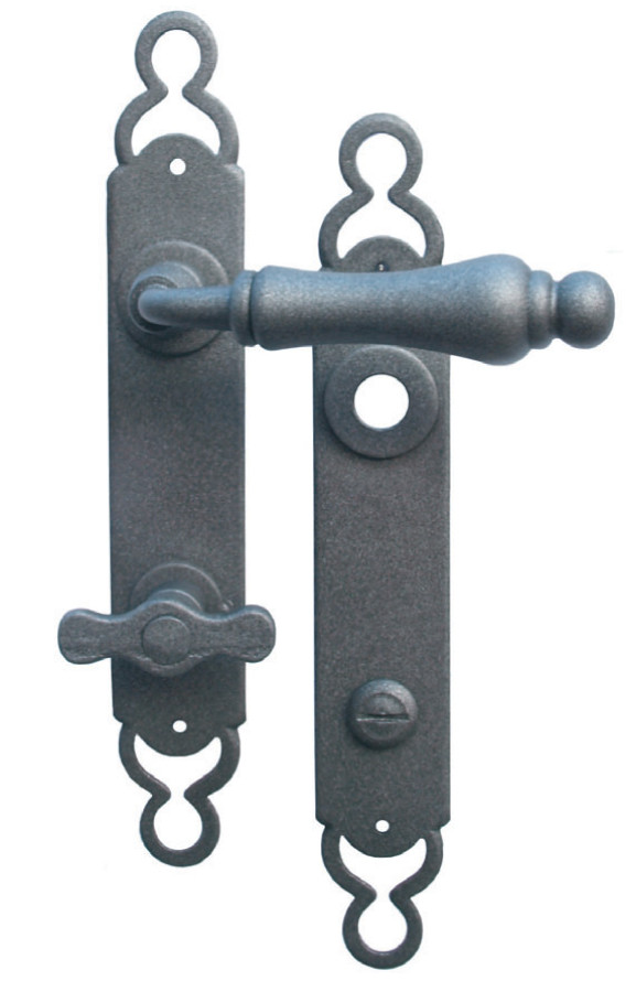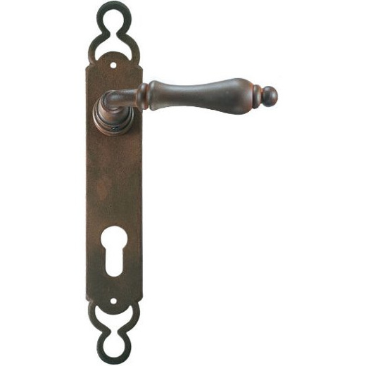 Klamka na szyldzie długim wykonana z ręcznie kutego żelaza. Wymiary: dł. rękojeści 125 mm, szyld 250x40 mm. Okucie dostępne jest w kilkunastu powłokach kolorystycznych. Pozwala to dobrać kolor klamki do kolorystyki drzwi.