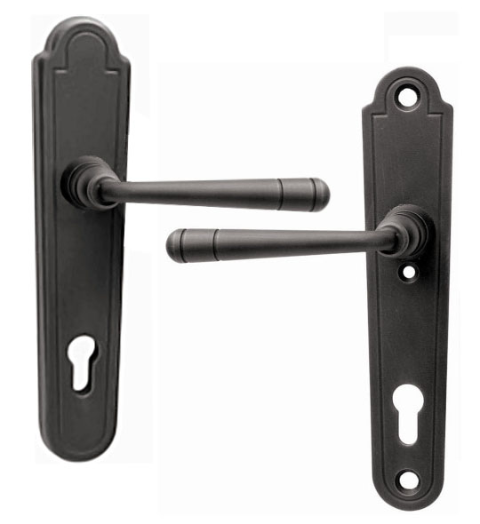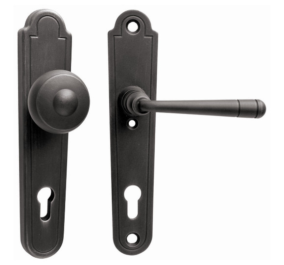 Klasyczna klamka na szyldzie długim wykonana z ręcznie kutego żelaza.