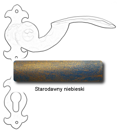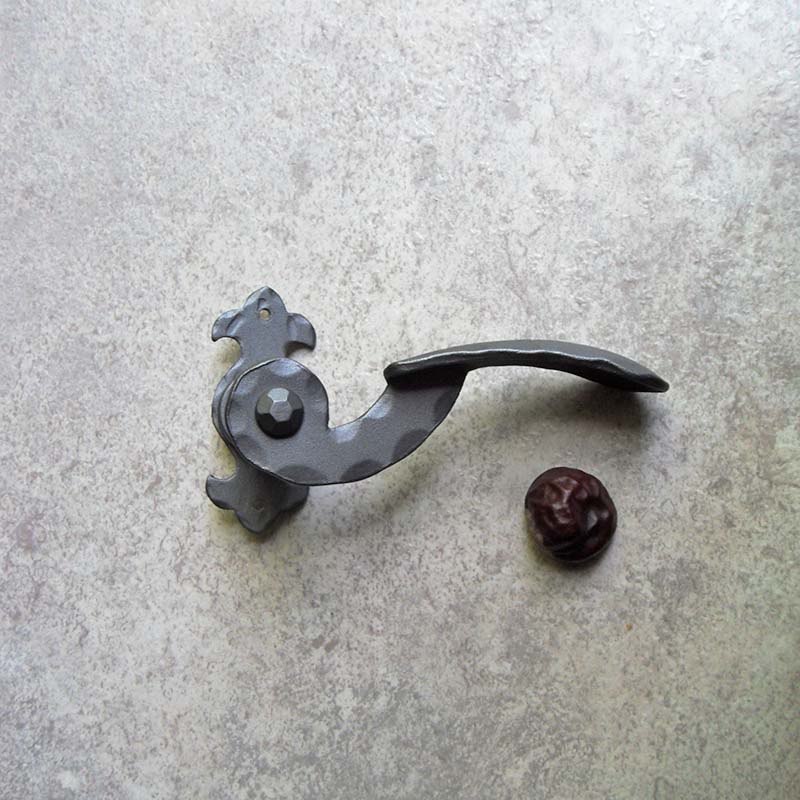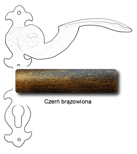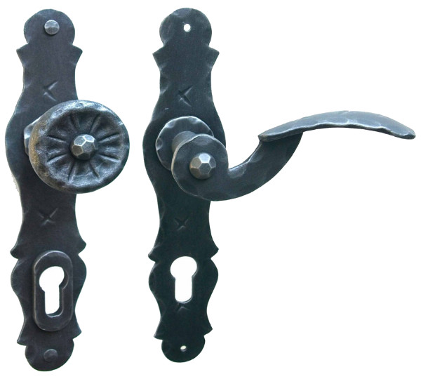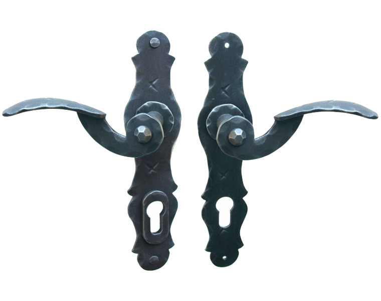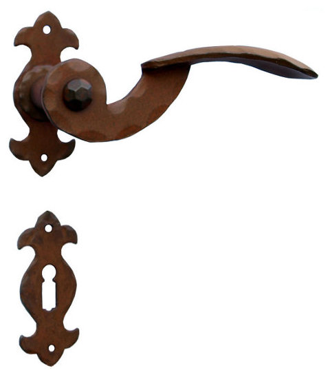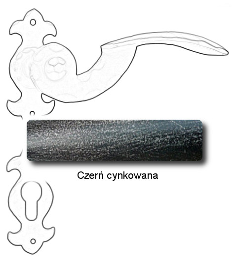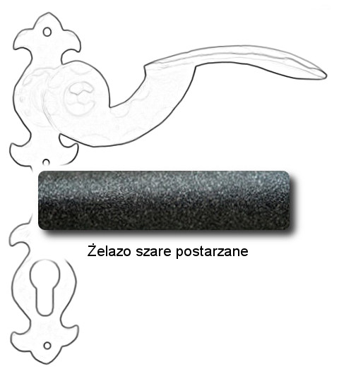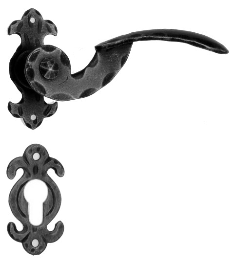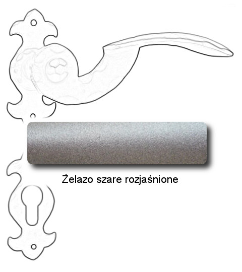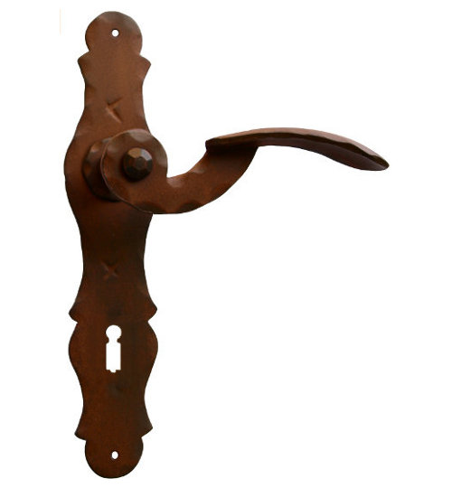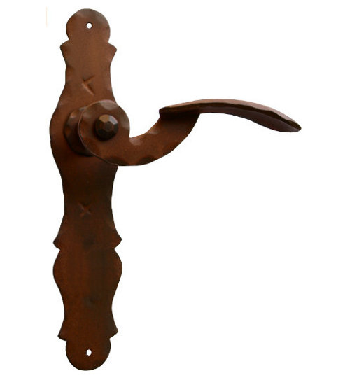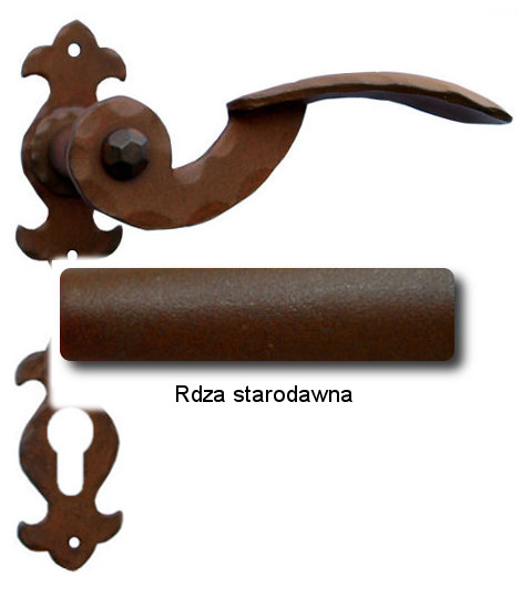 Rustykalna klamka na rozecie wykonana z ręcznie kutego żelaza i dostępna w czternastu powłokach kolorystycznych. Dostępne warianty: bez dolnej rozety, z rozetą na wkładkę, klucz oraz z blokadą WC.