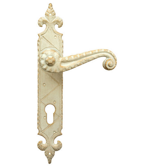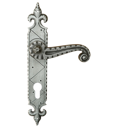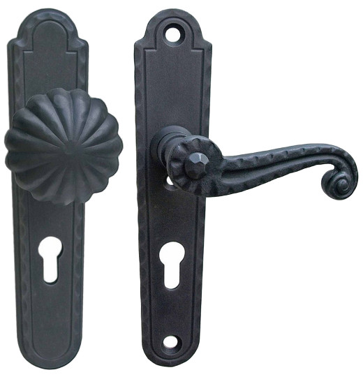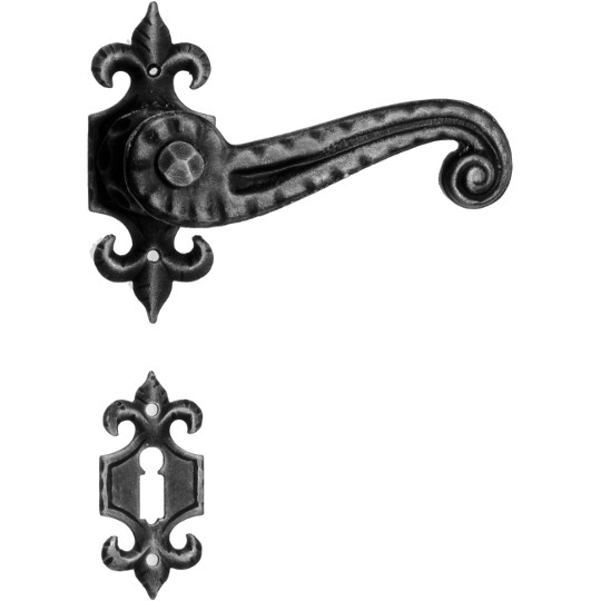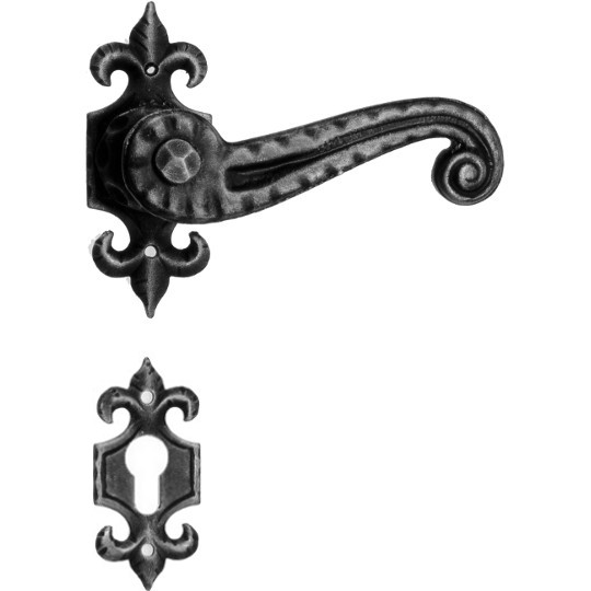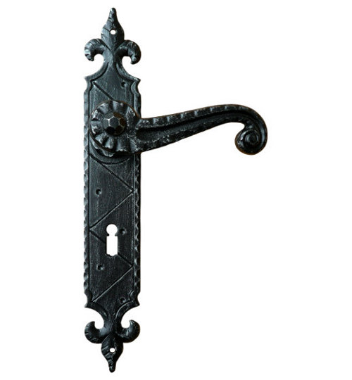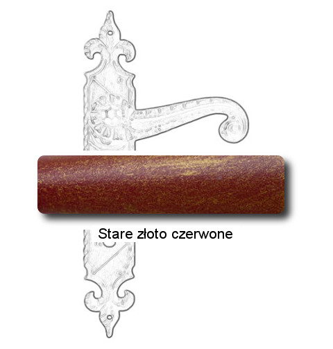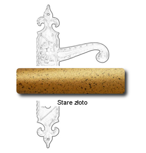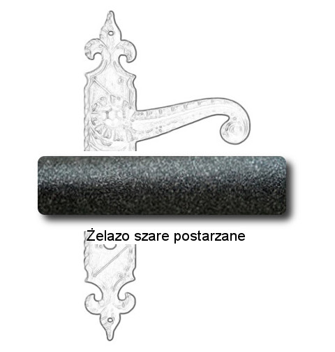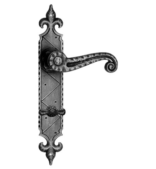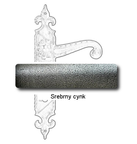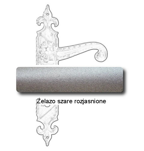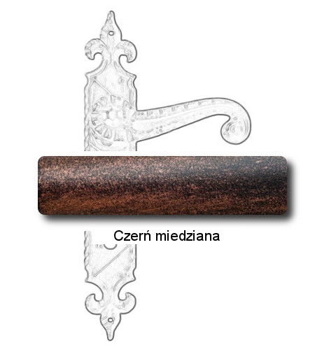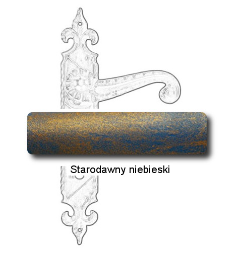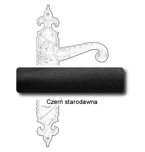 Rustykalna klamka na szyldzie długim wykonana z ręcznie kutego żelaza i dostępna w trzynastu powłokach kolorystycznych. Dostępne warianty: z otworem na klucz, na wkładkę, oraz z blokadą WC.