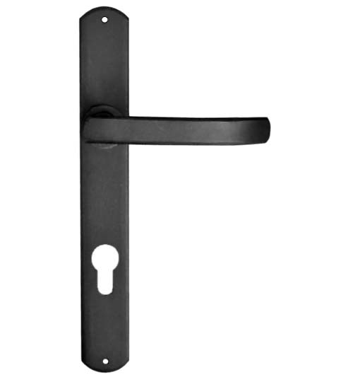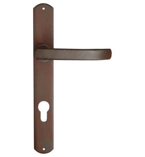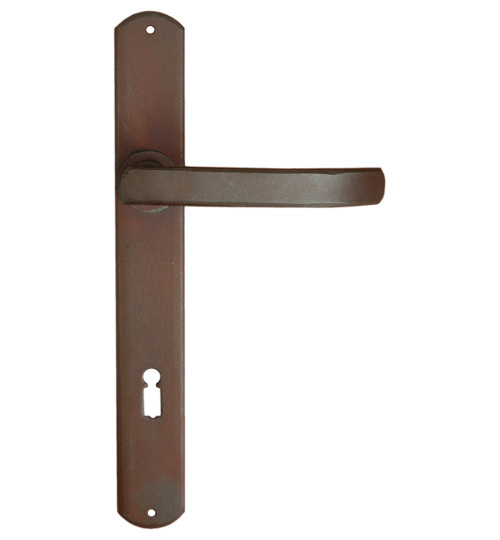 Klasyczna klamka na szyldzie długim wykonana z ręcznie kutego żelaza i dostępna w trzynastu powłokach kolorystycznych. Dostępne warianty: z otworem na klucz, na wkładkę, oraz z blokadą WC.