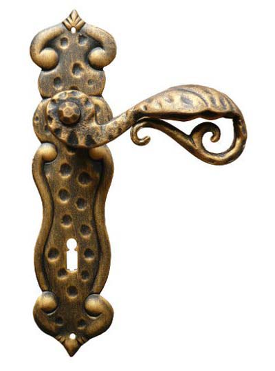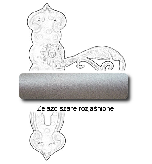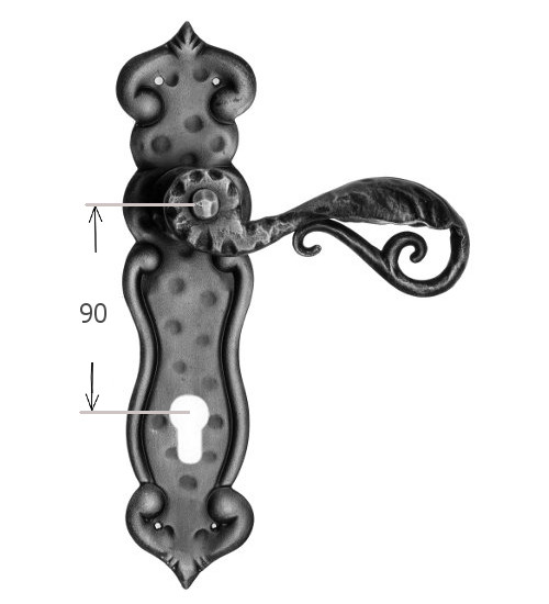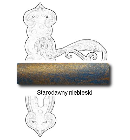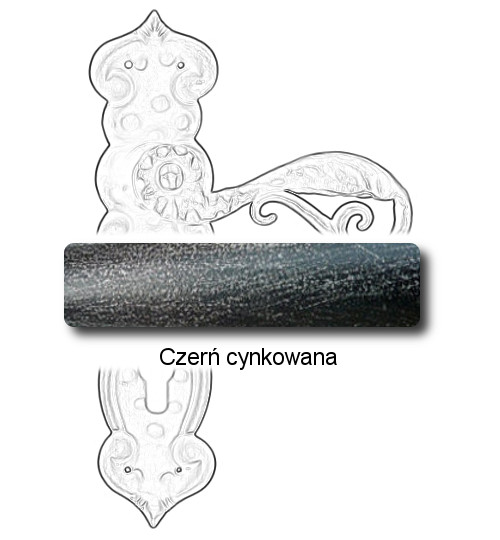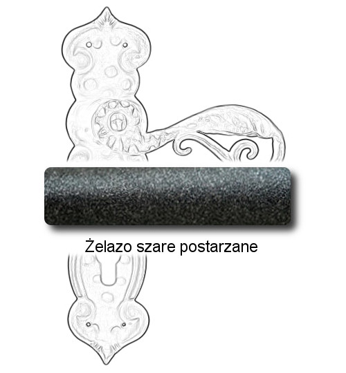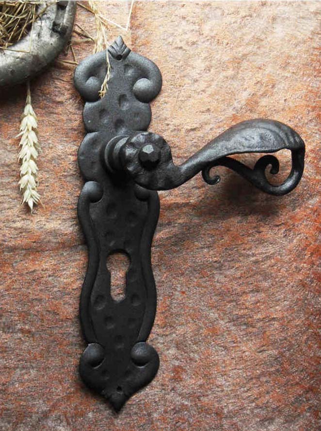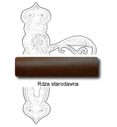 Rustykalna klamka na szyldzie długim wykonana z ręcznie kutego żelaza i dostępna w trzynastu powłokach kolorystycznych. Dostępne warianty: bez dolnego otworu, z otworem na klucz, na wkładkę oraz z blokadą WC.