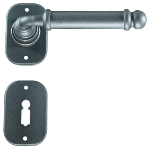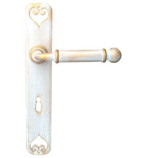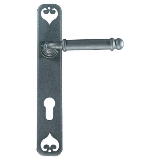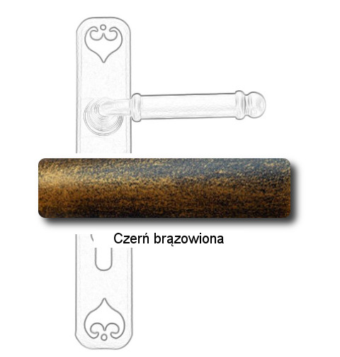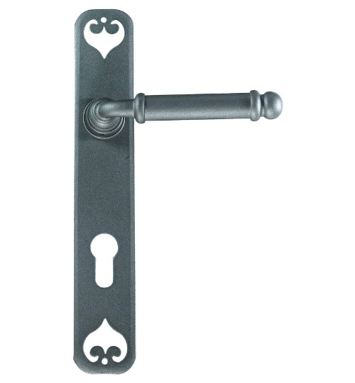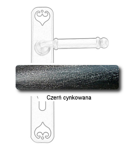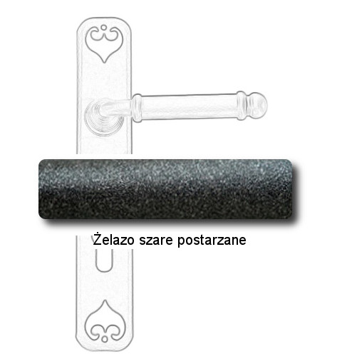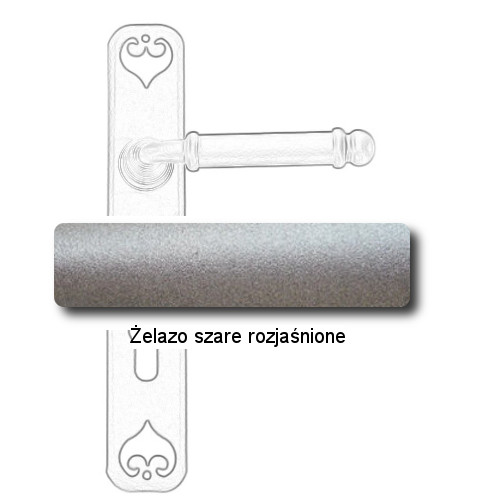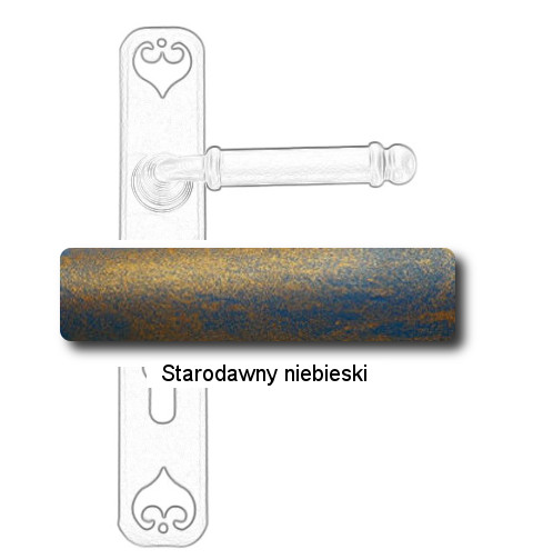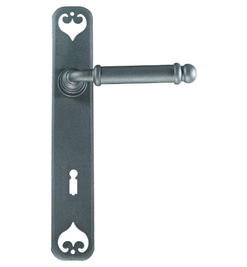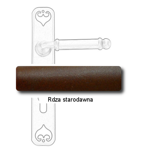 Klasyczna klamka na szyldzie długim wykonana z ręcznie kutego żelaza i dostępna w trzynastu powłokach kolorystycznych. Dostępne warianty: bez otworu, z otworem na klucz, na wkładkę oraz z blokadą WC.
