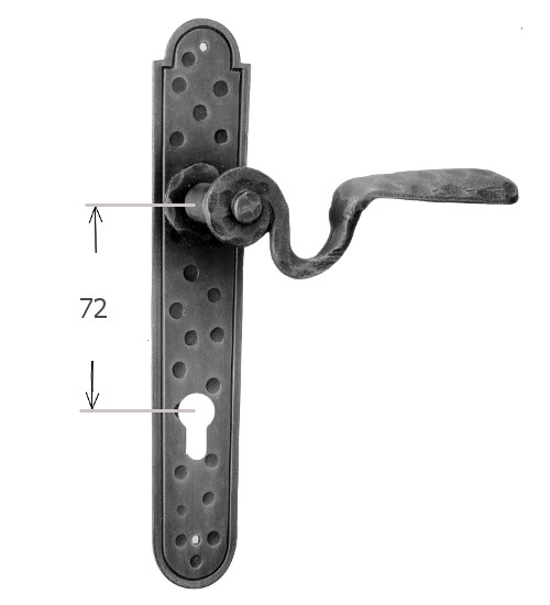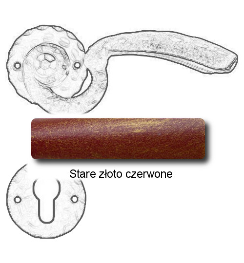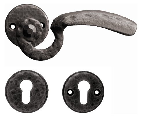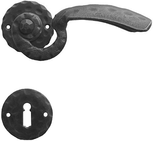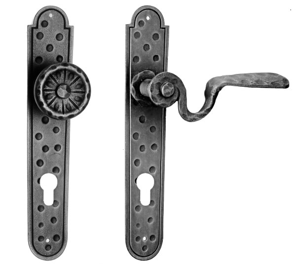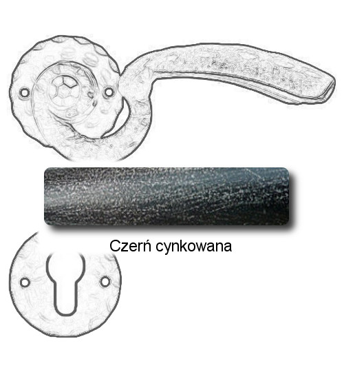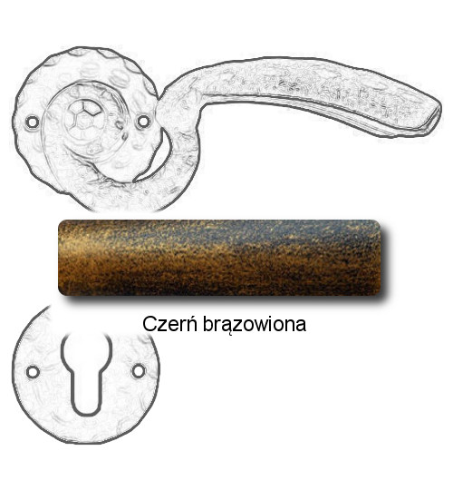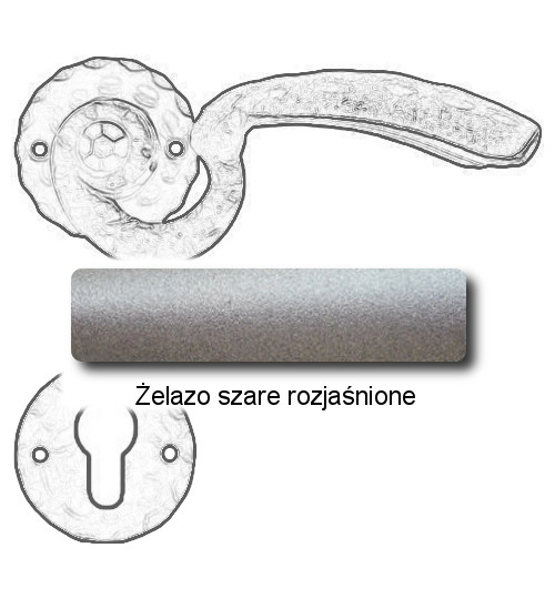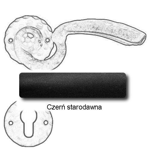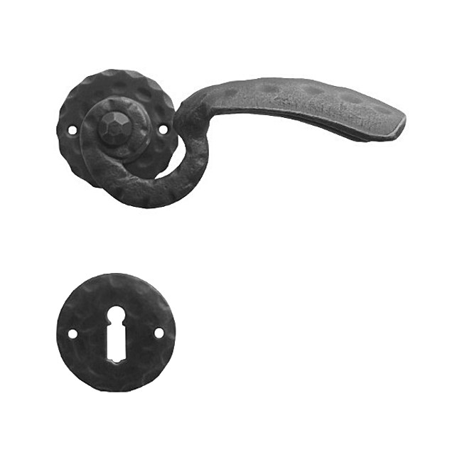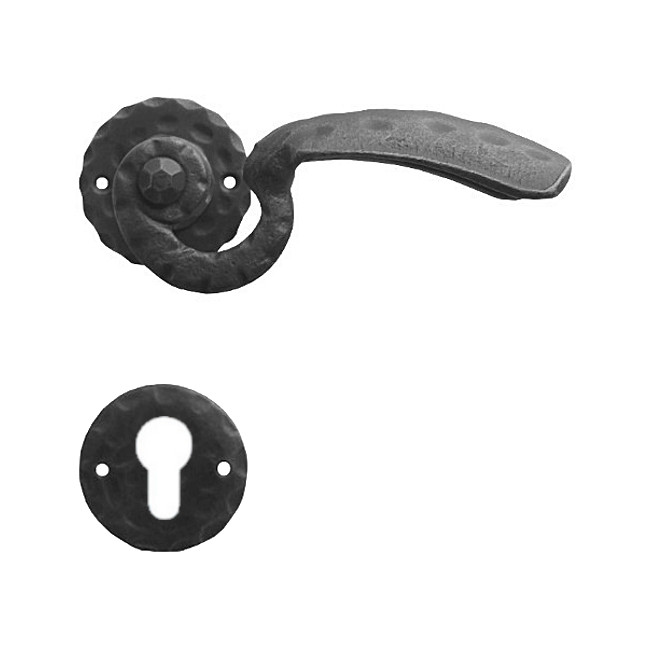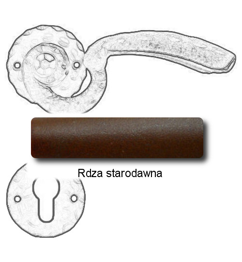 Rustykalna klamka na rozecie wykonana z ręcznie kutego żelaza i dostępna w trzynastu powłokach kolorystycznych. Dostępne warianty: bez dolnej rozety, z dolną rozetą na klucz, na wkładkę oraz z blokadą WC.