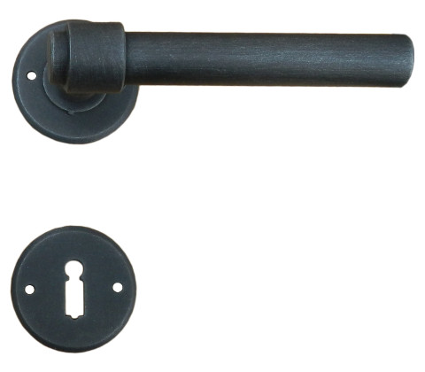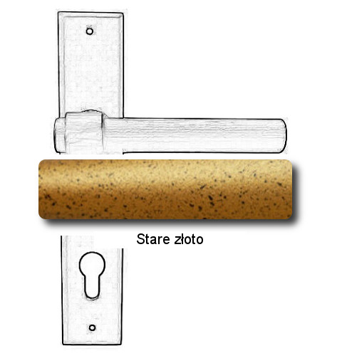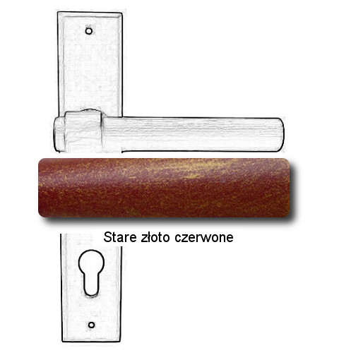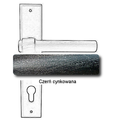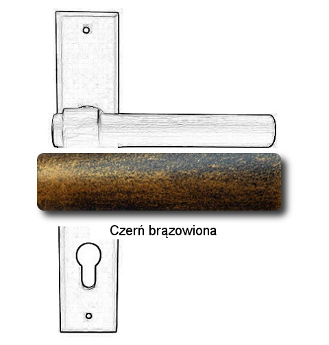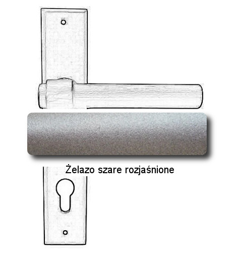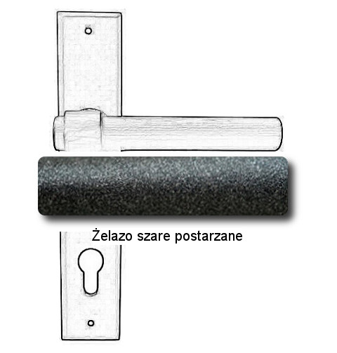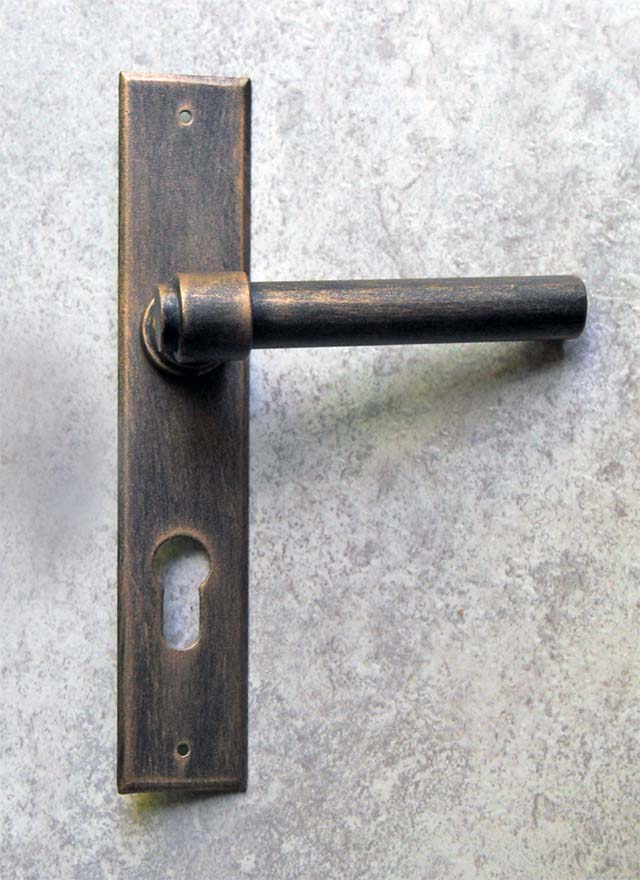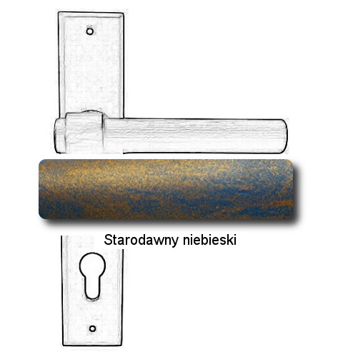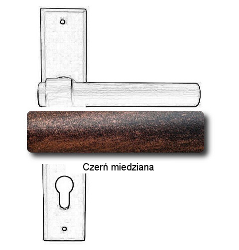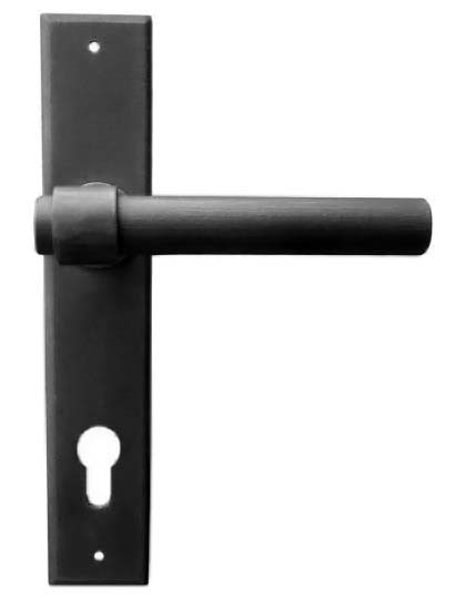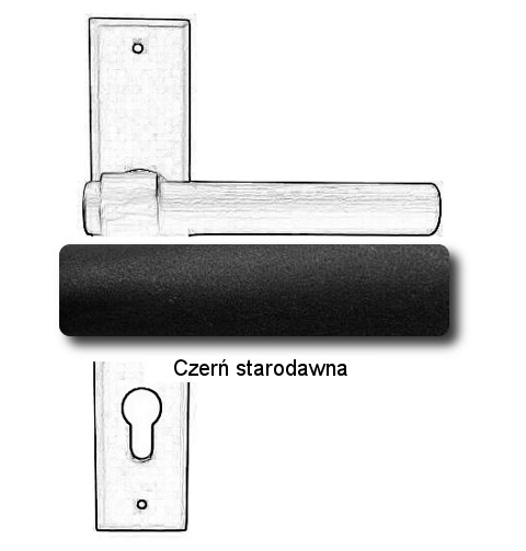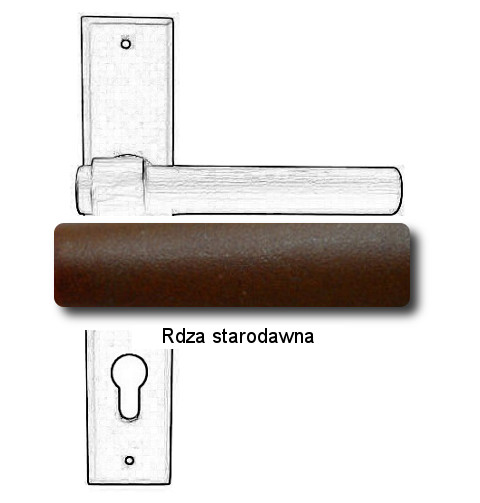 Klamka z kolekcji Modern na szyldzie długim wykonana z ręcznie kutego żelaza i dostępna w trzynastu powłokach kolorystycznych. Dostępne warianty: bez dolnego otworu, z otworem na klucz, z otworem na wkładkę oraz z blokadą WC.