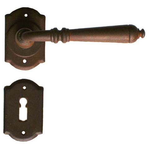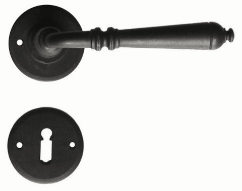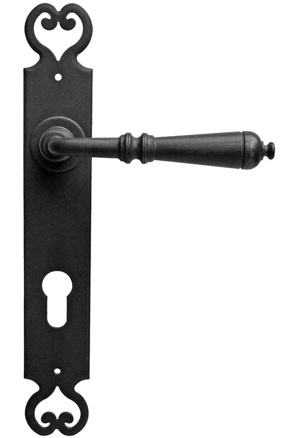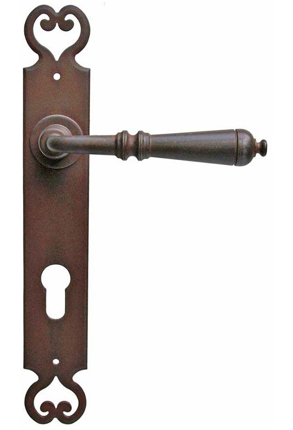 Klasyczna klamka na szyldzie długim wykonana z ręcznie kutego żelaza i dostępna w trzynastu powłokach kolorystycznych. Dostępne warianty: bez dolnego otworu, z dolnym otworem na klucz, na wkładkę oraz z blokadą WC.