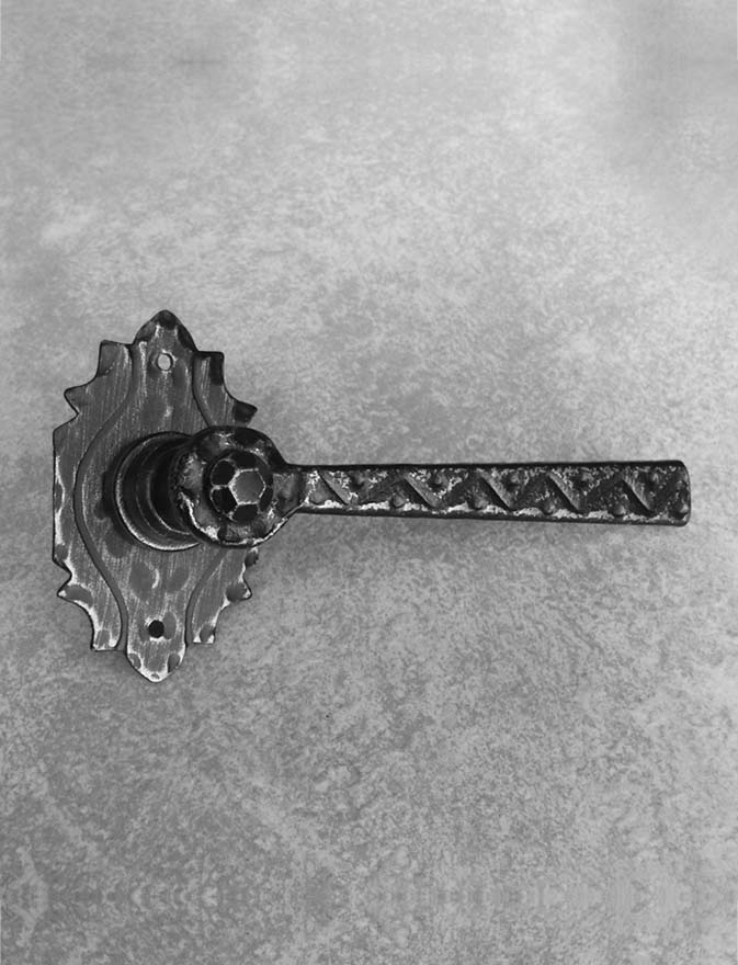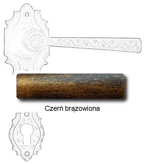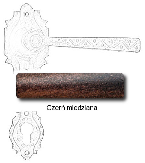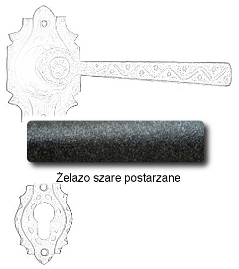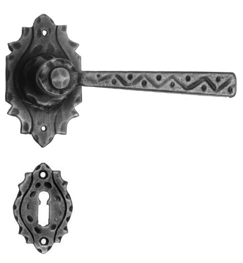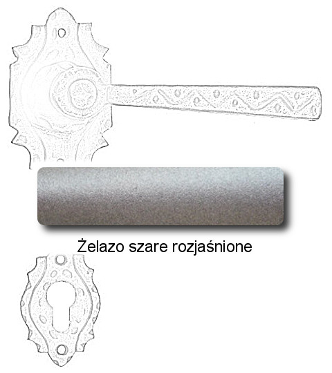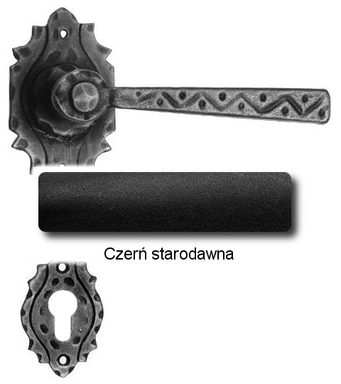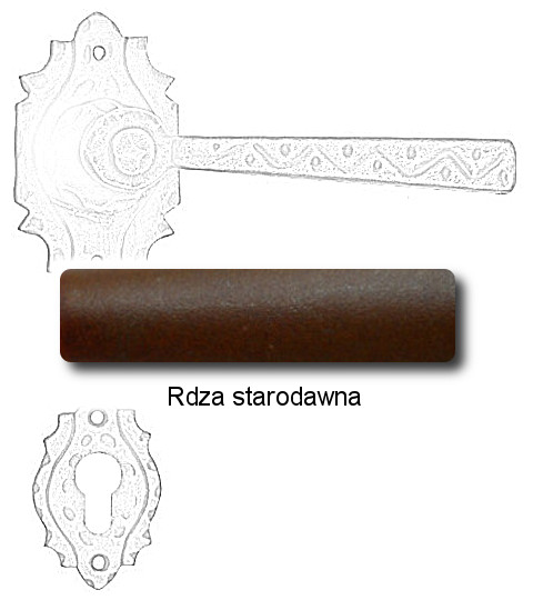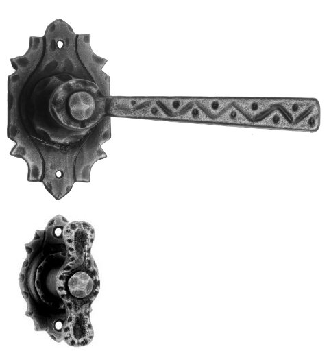 Rustykalna klamka na rozecie wykonana z ręcznie kutego żelaza i dostępna w trzynastu powłokach kolorystycznych. Dostępne warianty: bez dolnej rozety, z dolną rozetą na klucz, na wkładkę oraz z blokadą WC.