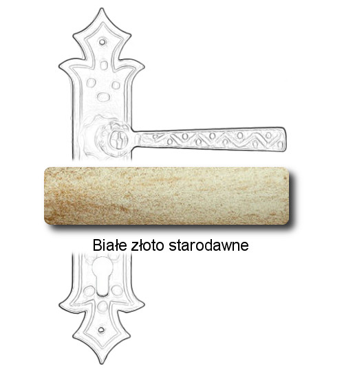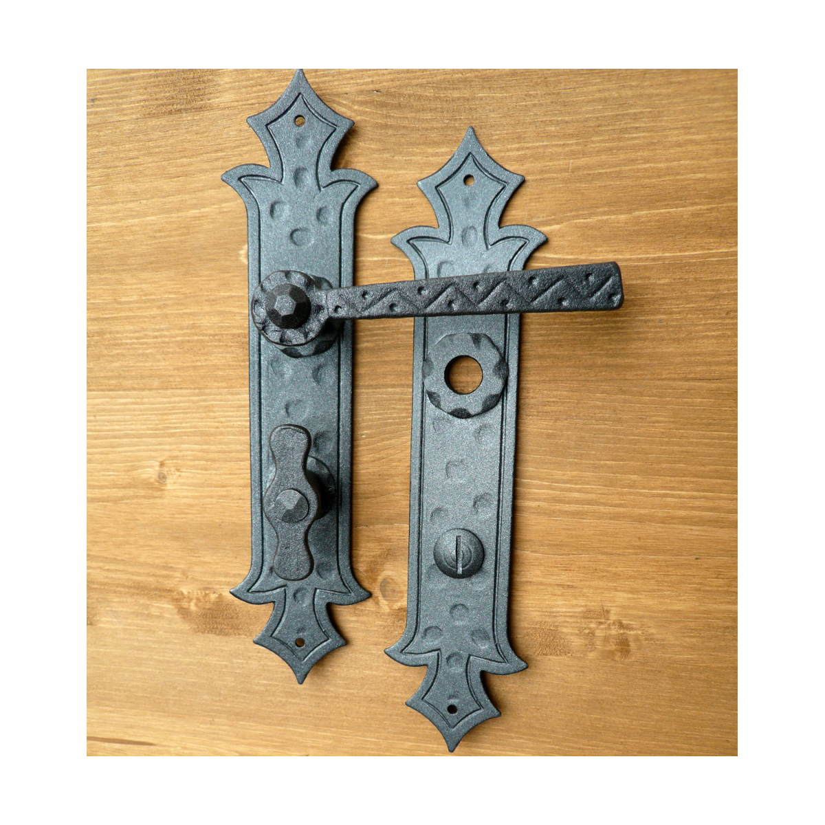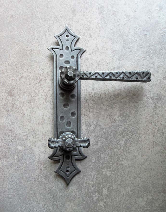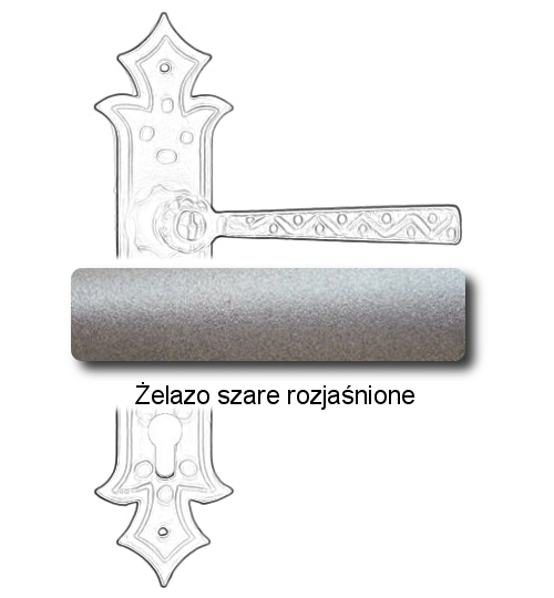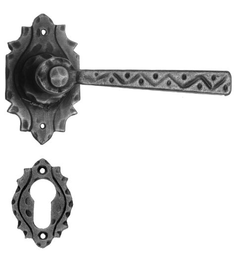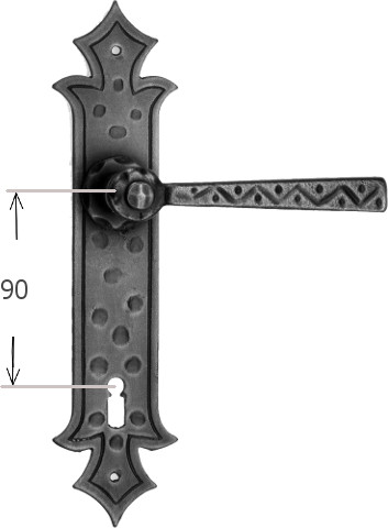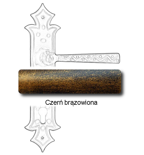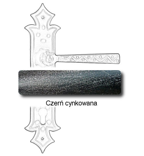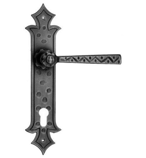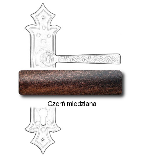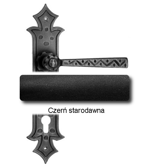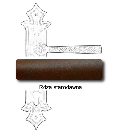Rustykalna klamka na szyldzie długim wykonana z ręcznie kutego żelaza i dostępna w trzynastu powłokach kolorystycznych. Dostępne warianty: bez dolnego otworu, z otworem na klucz, na wkładkę oraz z blokadą WC.