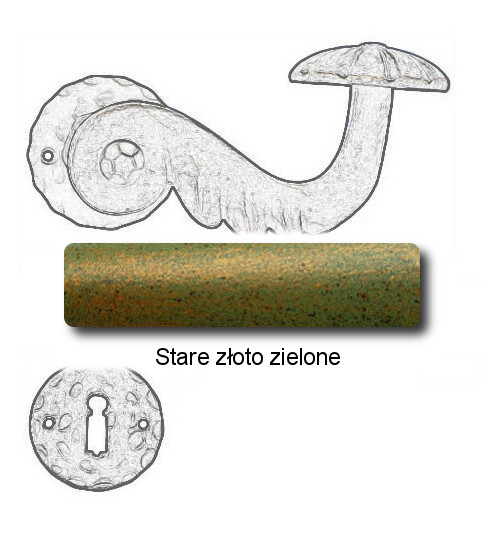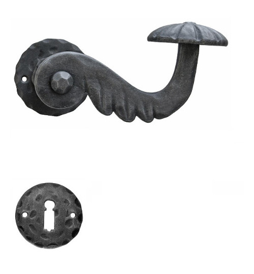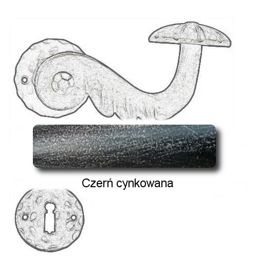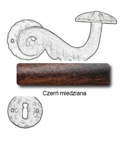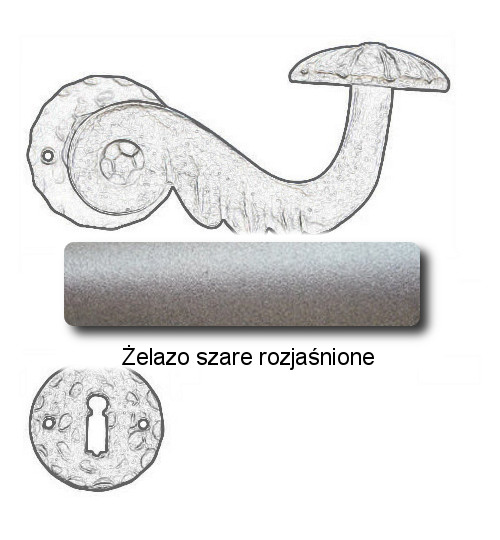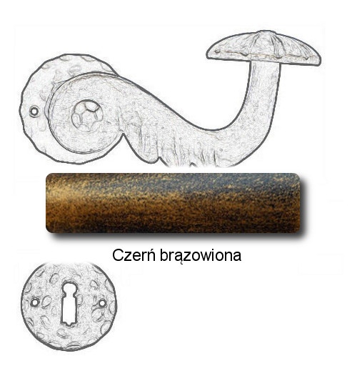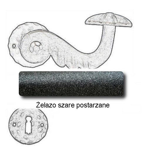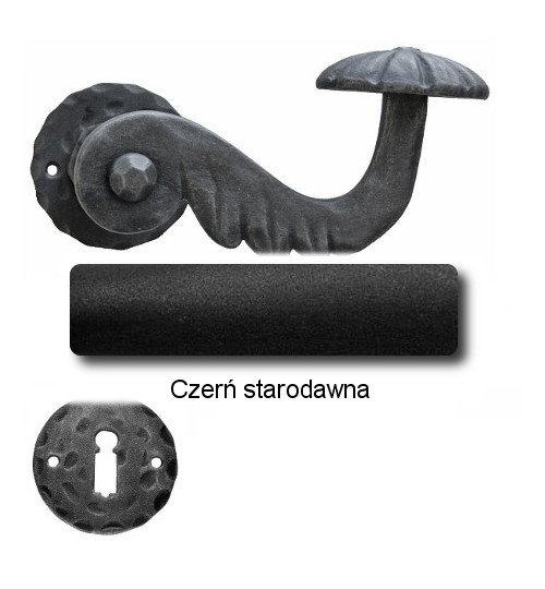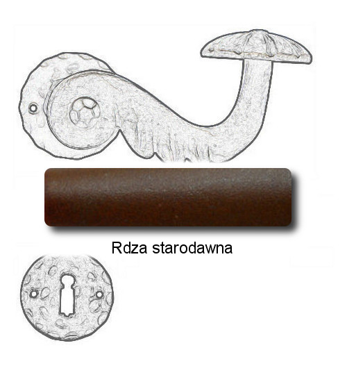 Rustykalna klamka na rozecie wykonana z ręcznie kutego żelaza i dostępna w trzynastu powłokach kolorystycznych. Dostępne warianty: bez dolnej rozety, z dolną rozetą na klucz, na wkładkę oraz z blokadą WC.