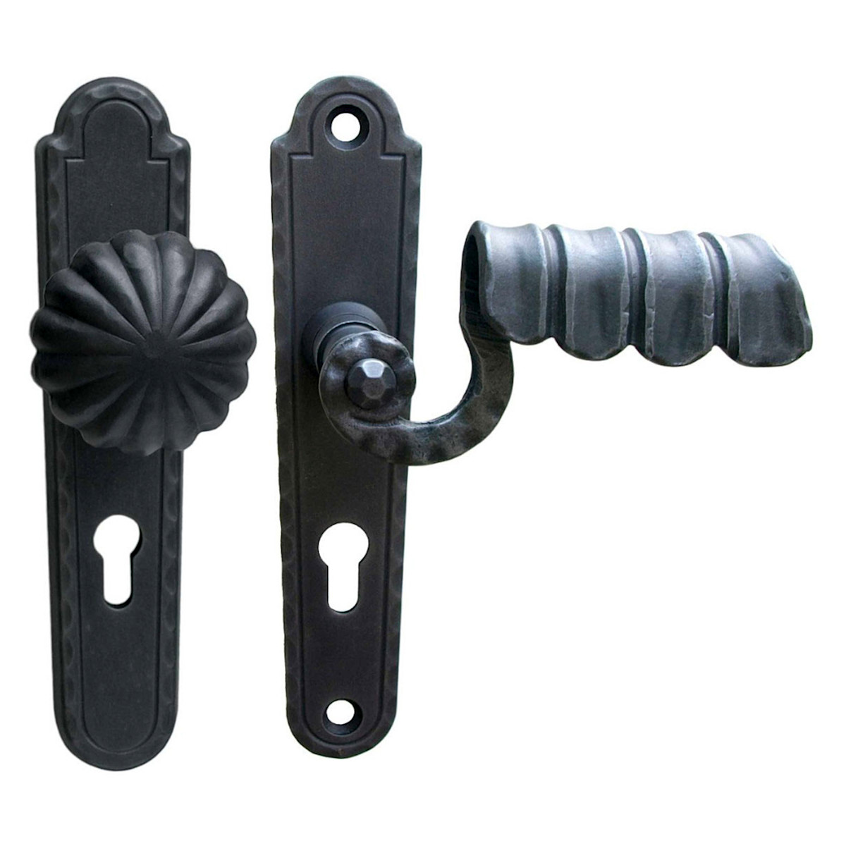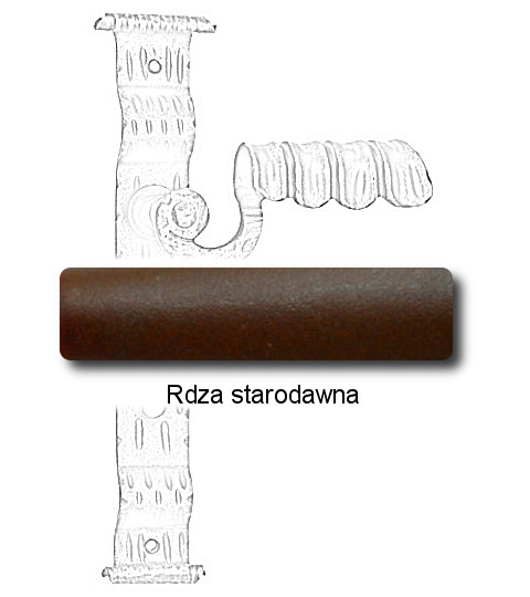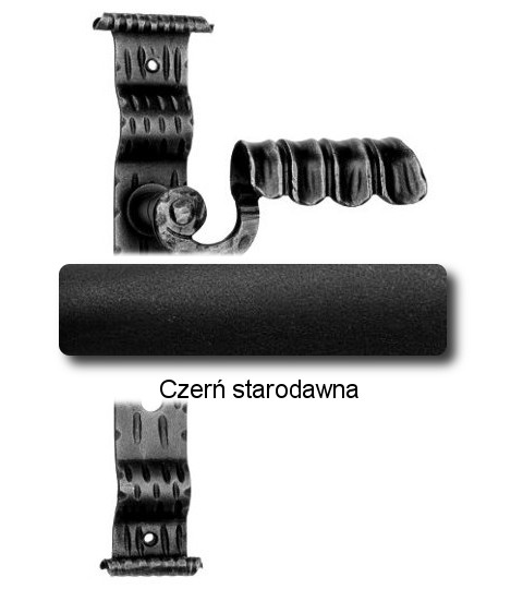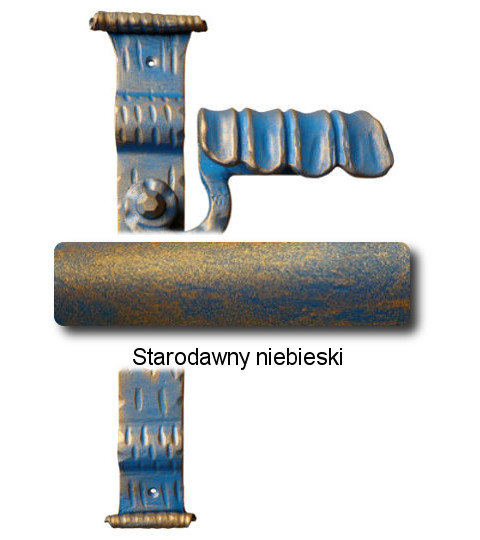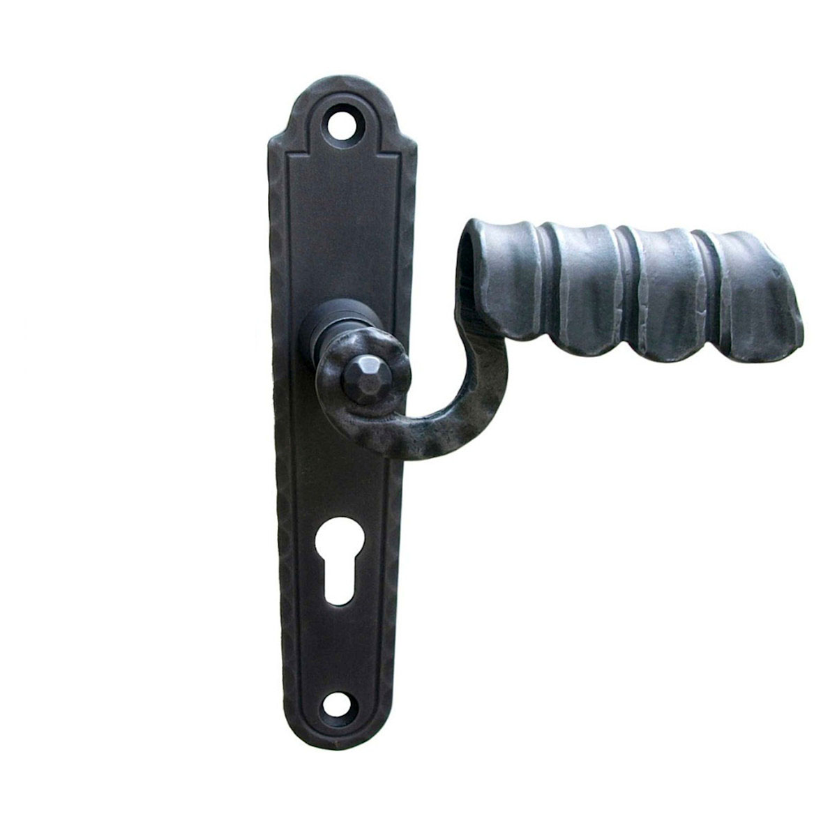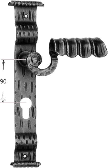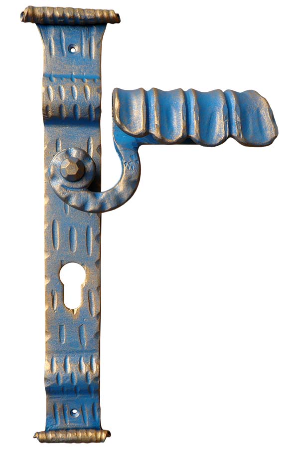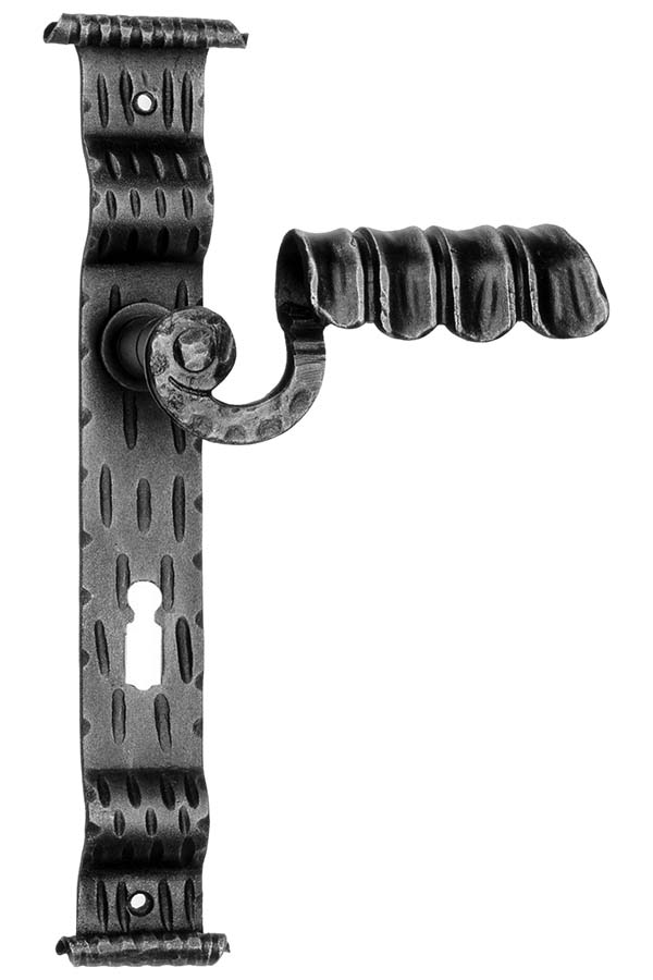 Rustykalna klamka na szyldzie długim wykonana z ręcznie kutego żelaza i dostępna w trzynastu powłokach kolorystycznych. Dostępne warianty: bez dolnego otworu, z otworem na klucz, na wkładkę oraz z blokadą WC.