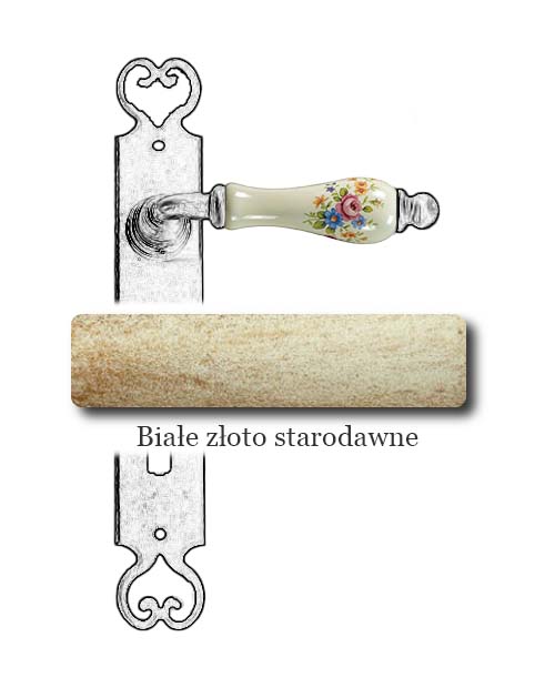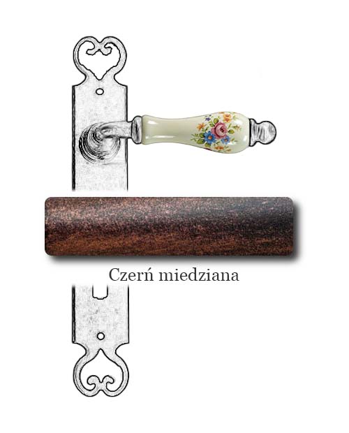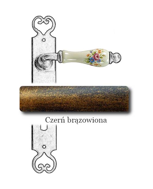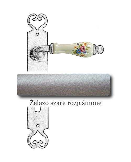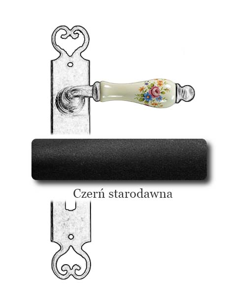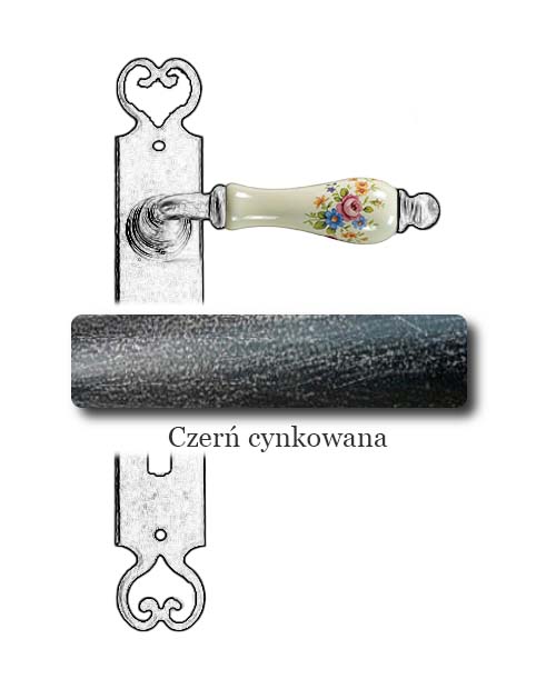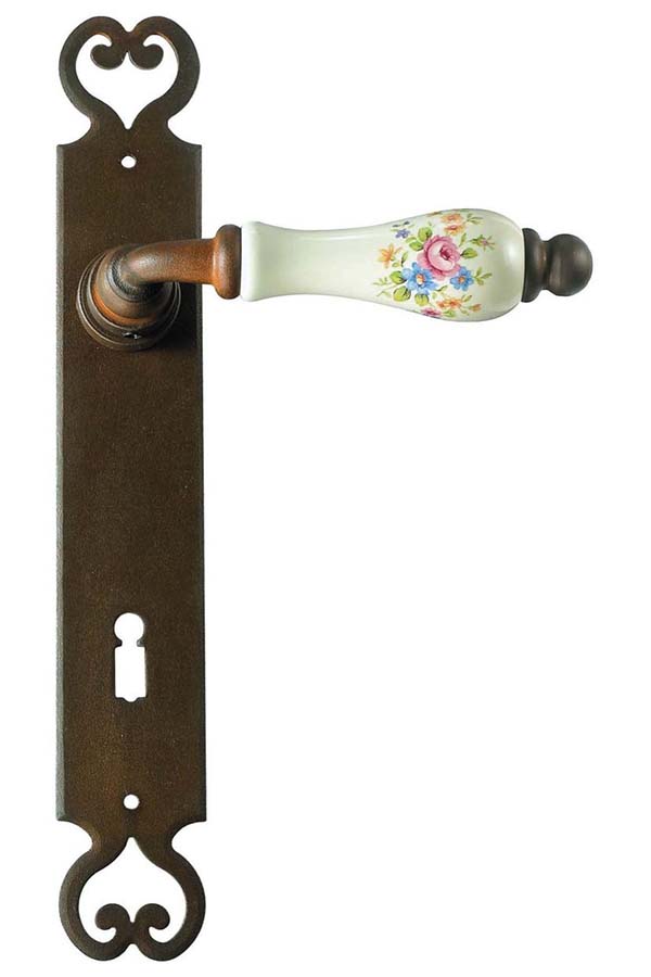 Klasyczna klamka na szyldzie długim wykonana z ręcznie kutego żelaza oraz oryginalnej porcelany Bavaria D22 (porcelana kremowa, kwiaty wiosenne). Dostępne warianty: bez otworu, z otworem na klucz, na wkładkę oraz z blokadą WC.