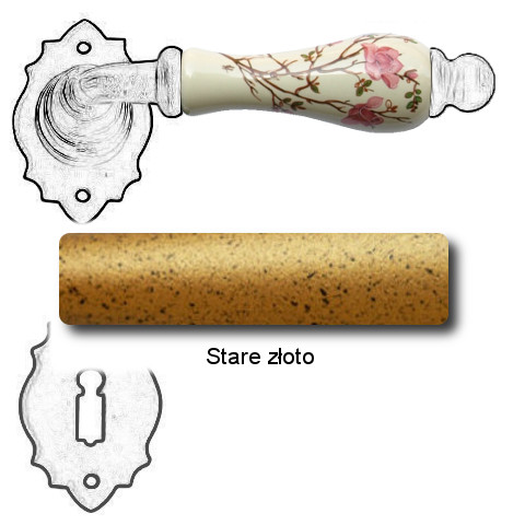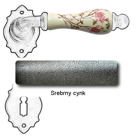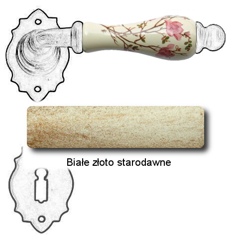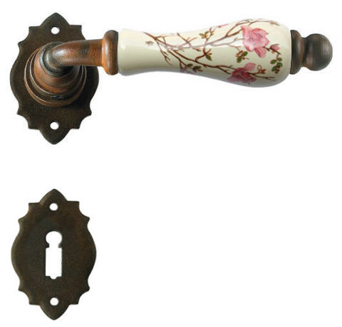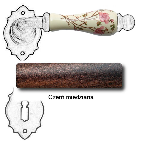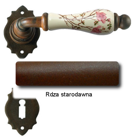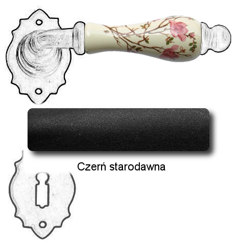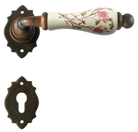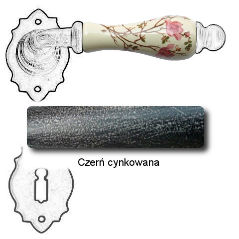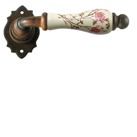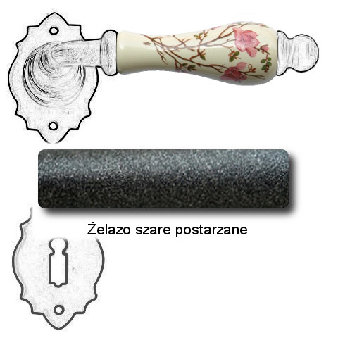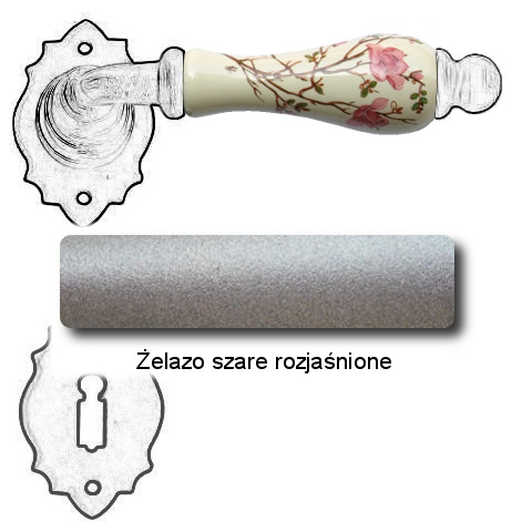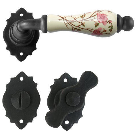 Klasyczna klamka na rozecie wykonana z ręcznie kutego żelaza oraz oryginalnej porcelany Bavaria D1 (porcelana kremowa, kwiat brzoskwini). Dostępne warianty: bez dolnej rozety, z dolną rozetą na klucz, na wkładkę oraz z blokadą WC.