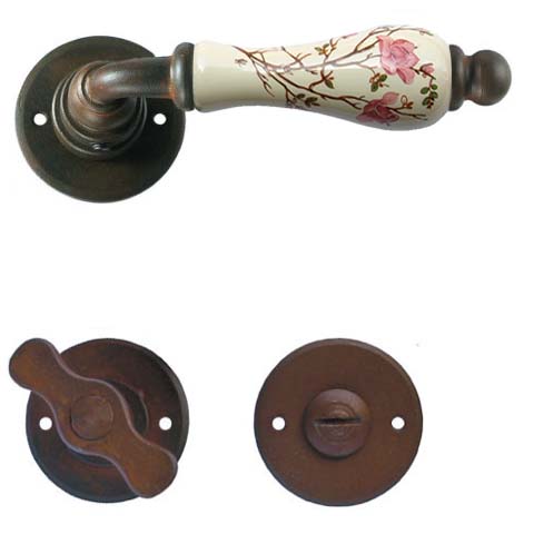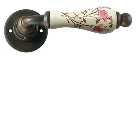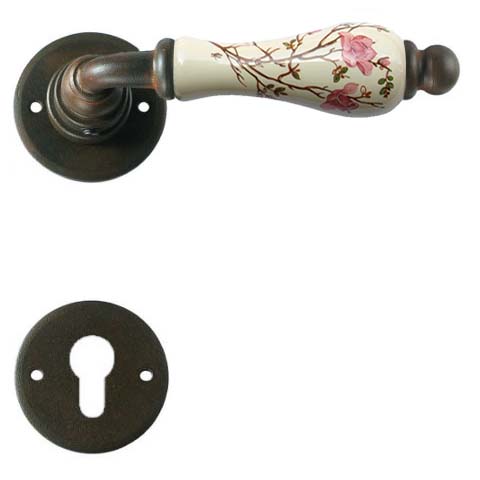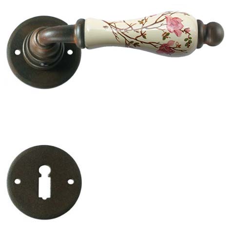 Klasyczna klamka na rozecie wykonana z ręcznie kutego żelaza oraz oryginalnej porcelany Bavaria D1 (porcelana kremowa brzoskwini). Dostępne warianty: bez dolnej rozety, z dolną rozetą na klucz, na wkładkę oraz z blokadą WC.