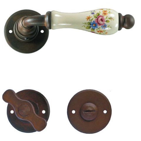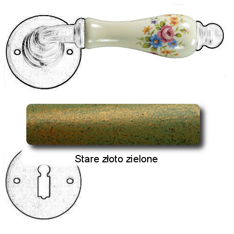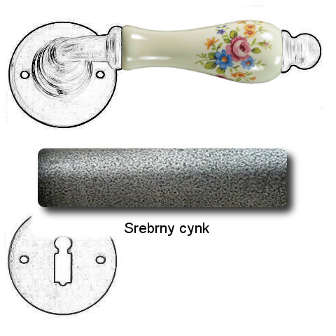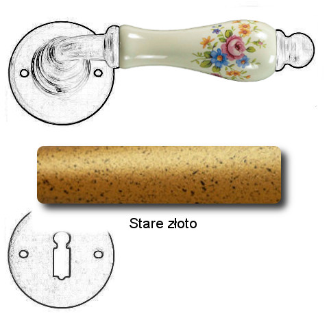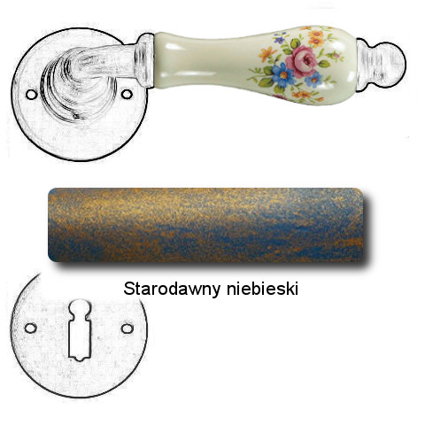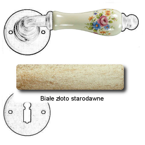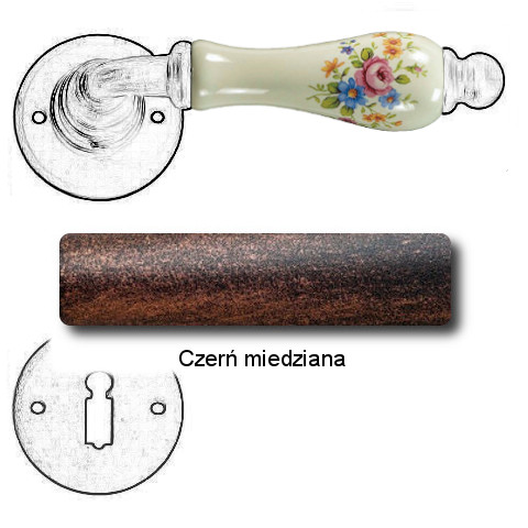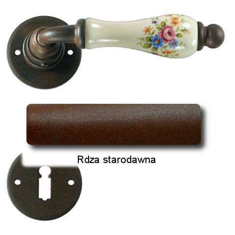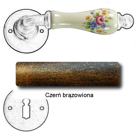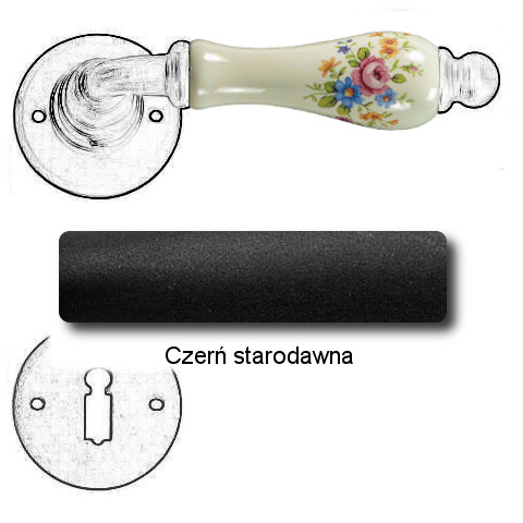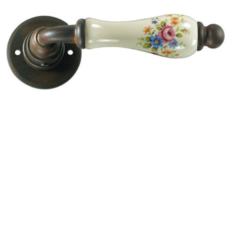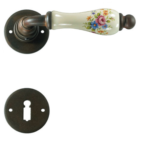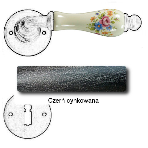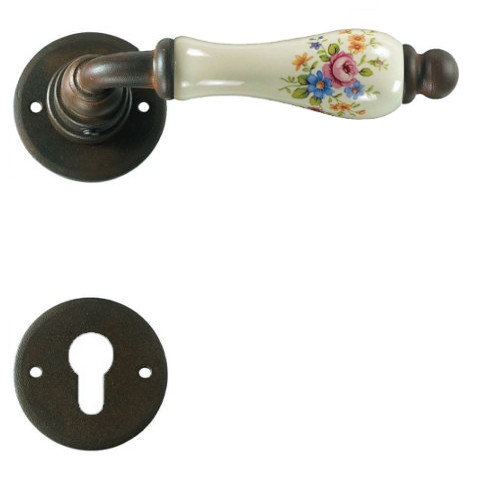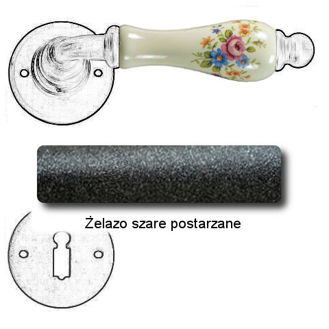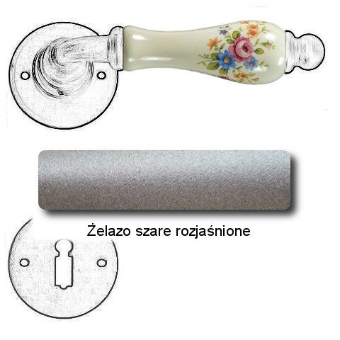 Klasyczna klamka na rozecie wykonana z ręcznie kutego żelaza oraz oryginalnej porcelany Bavaria D22 (porcelana kremowa kwiaty wiosenne). Dostępne warianty: bez dolnej rozety, z dolną rozetą na klucz, na wkładkę oraz z blokadą WC.