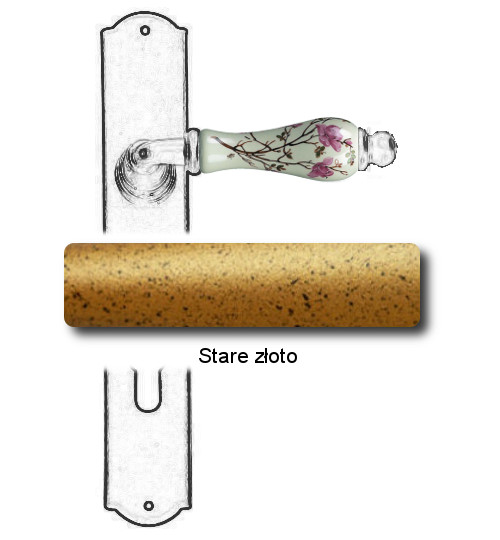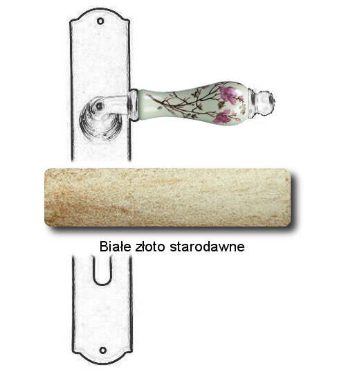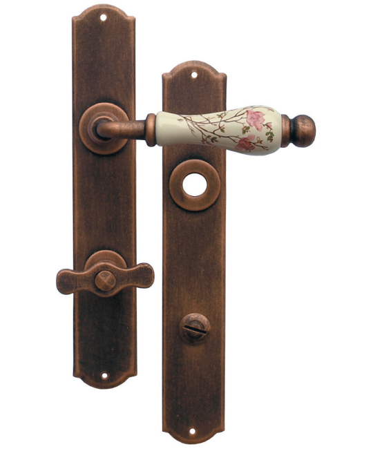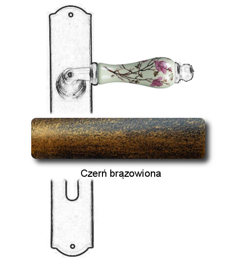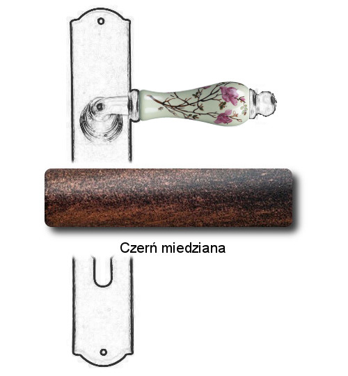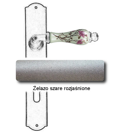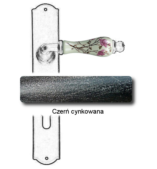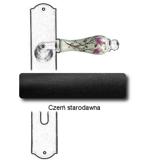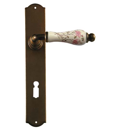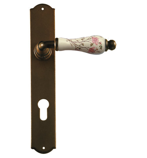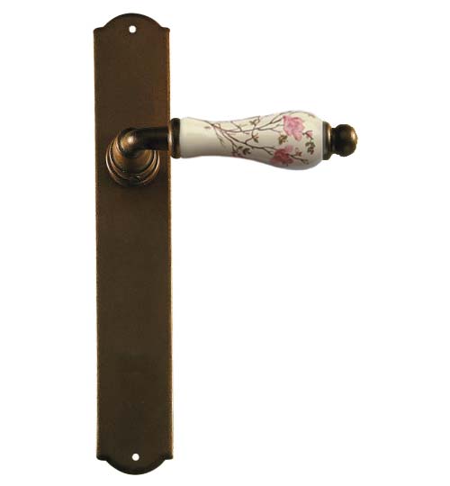 Klasyczna klamka na szyldzie długim wykonana z ręcznie kutego żelaza oraz oryginalnej porcelany Bavaria D1 (porcelana kremowa kwiat brzoskwini). Dostępne warianty: bez otworu, z otworem na klucz, na wkładkę oraz z blokadą WC.