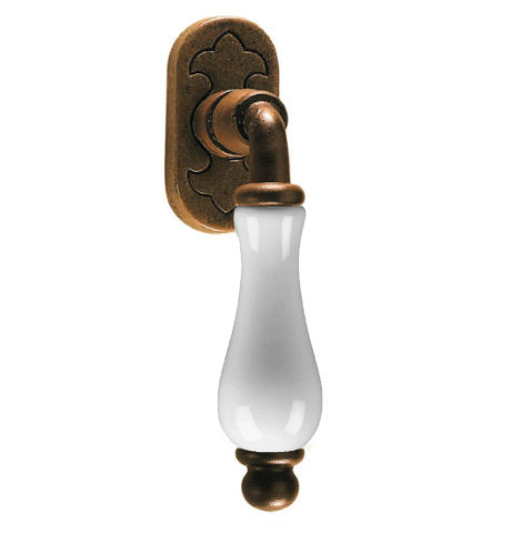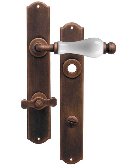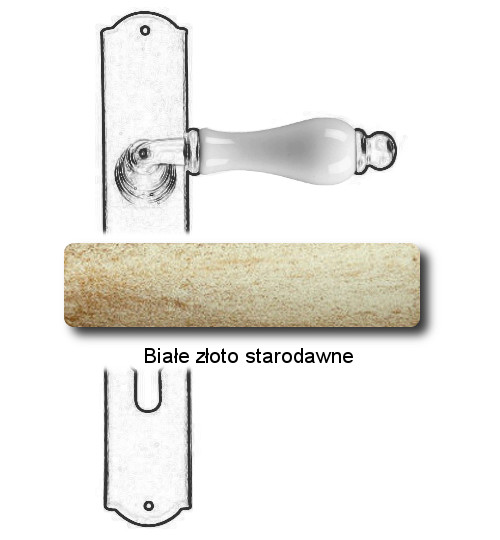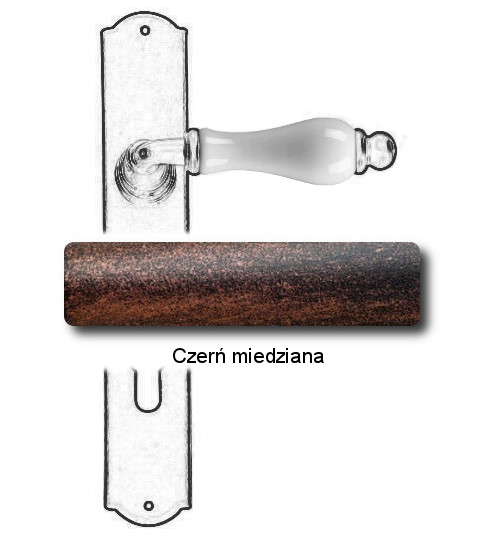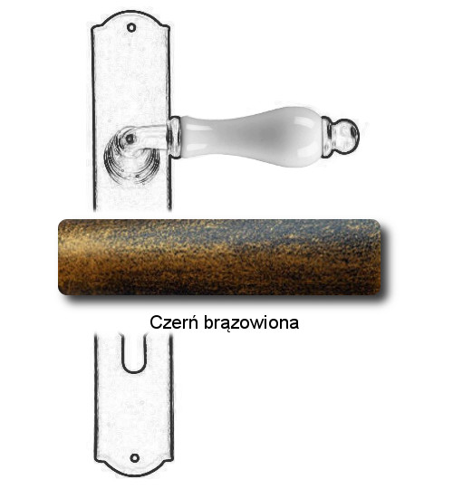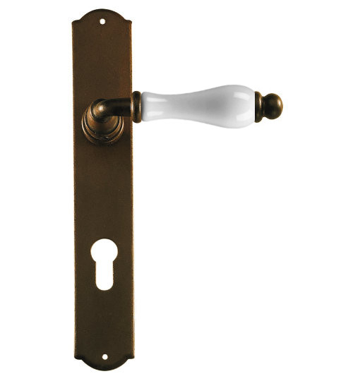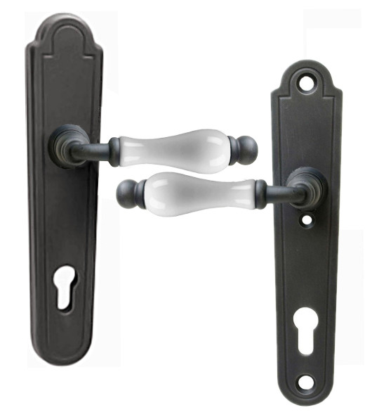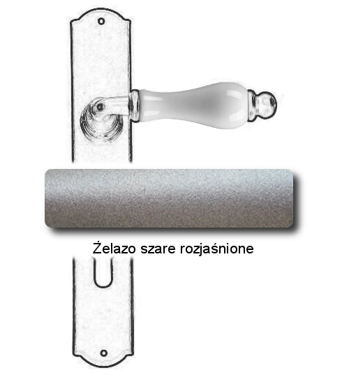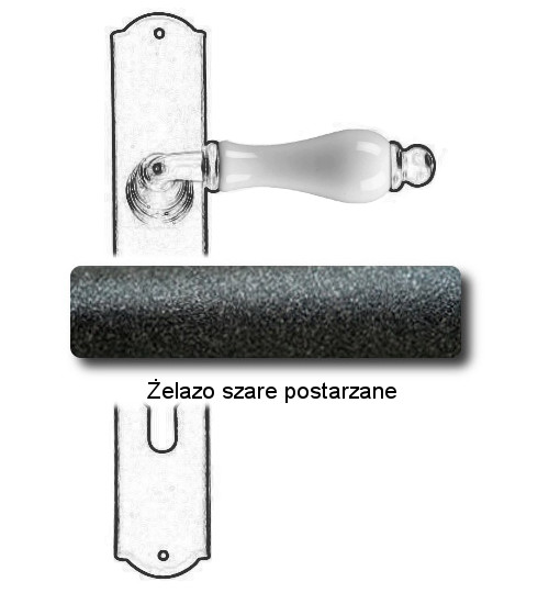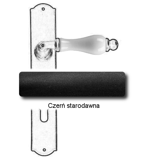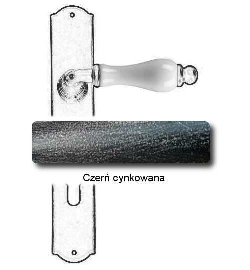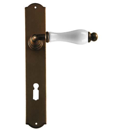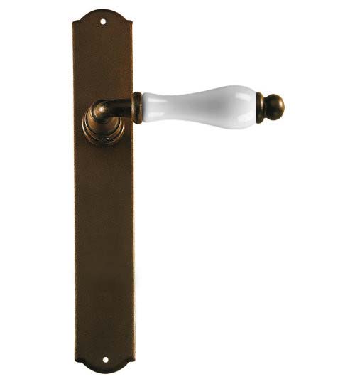 Klasyczna klamka na szyldzie długim wykonana z ręcznie kutego żelaza oraz oryginalnej porcelany Bavaria D1 (porcelana biała bez motywu). Dostępne warianty: bez otworu, z otworem na klucz, na wkładkę oraz z blokadą WC.